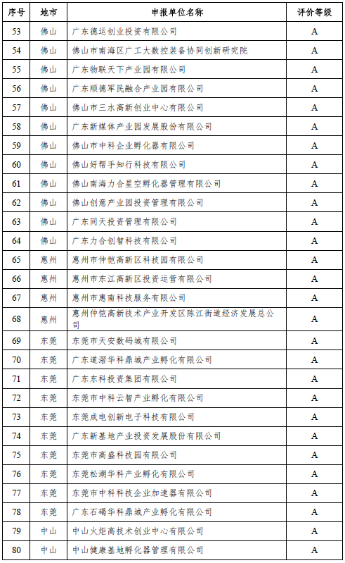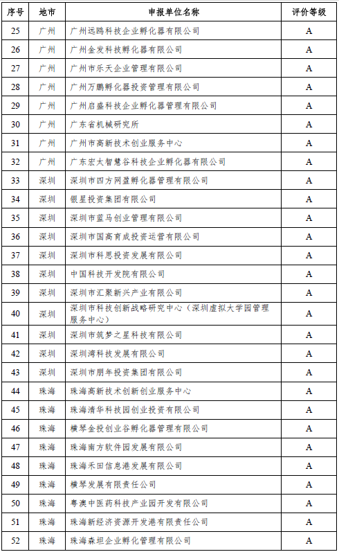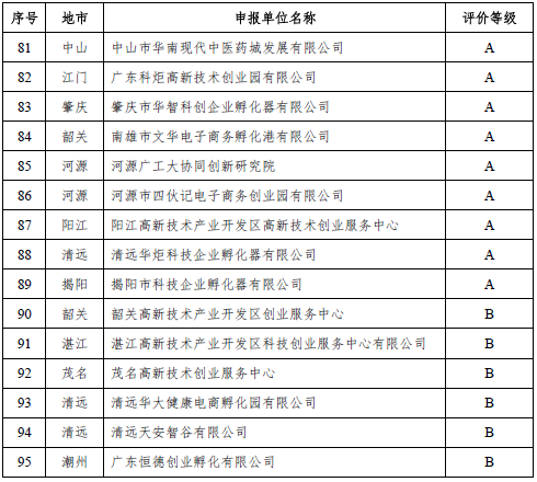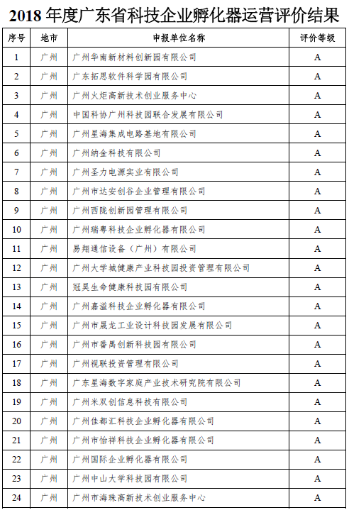 現(xiàn)將全省被評為優(yōu)秀(A級)的孵化器、眾創(chuàng)空間,粵東西北地區(qū)被評為良好(B級)的孵化器、眾創(chuàng)空間名單予以公布。