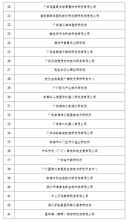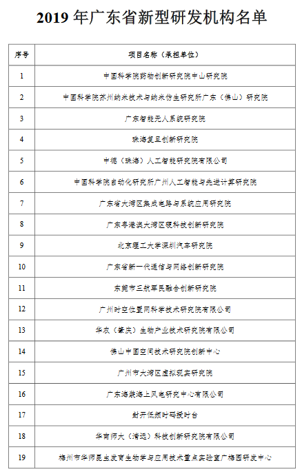 廣東省科學技術廳關于2019年廣東省新型研發機構名單的公示