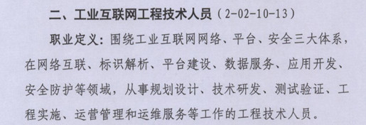工業(yè)互聯(lián)網(wǎng)是新出來的業(yè)態(tài),工業(yè)互聯(lián)網(wǎng)工程技術(shù)人員的職業(yè)定義是:圍繞工業(yè)互聯(lián)網(wǎng)網(wǎng)絡(luò)、平臺、安全三大體系,在網(wǎng)絡(luò)互聯(lián)、標識解析、平臺建設(shè)、數(shù)據(jù)服務(wù)、應(yīng)用開發(fā)、安全防護等領(lǐng)域,從事規(guī)劃設(shè)計、技術(shù)開發(fā)、測試驗證、工程實施、運營管理和運維服務(wù)等工作的工程技術(shù)人員。