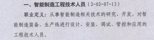 像《通告》里的智能制造工程技術(shù)人員,職業(yè)定義為:從事智能制造相關(guān)技術(shù)的研究、開發(fā)、對智能制造裝備、生產(chǎn)線進行設(shè)計、安裝、調(diào)試、管控和應(yīng)用的工程技術(shù)人員。