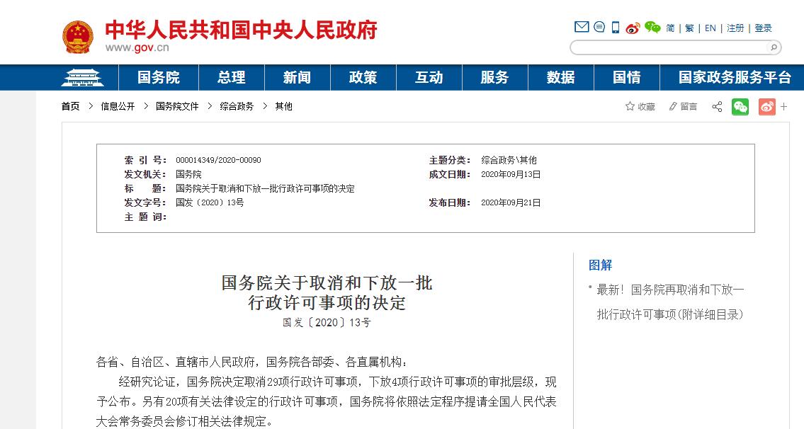 經(jīng)研究論證,國務(wù)院決定取消29項(xiàng)行政許可事項(xiàng),下放4項(xiàng)行政許可事項(xiàng)的審批層級(jí),現(xiàn)予公布。另有20項(xiàng)有關(guān)法律設(shè)定的行政許可事項(xiàng),國務(wù)院將依照法定程序提請全國人民代表大會(huì)常務(wù)委員會(huì)修訂相關(guān)法律規(guī)定。