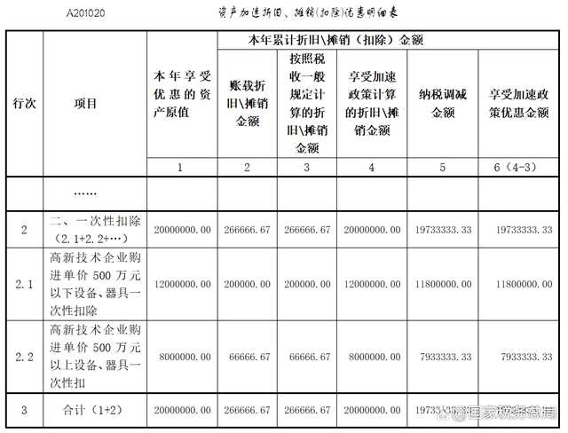 第一步,先填報(bào)一次性扣除情況。對(duì)于單價(jià)500萬(wàn)元以下設(shè)備、器具,在《資產(chǎn)加速折舊、攤銷(扣除)優(yōu)惠明細(xì)表》(A201020)第2行“二、一次性扣除”下的明細(xì)行次中填寫“高新技術(shù)企業(yè)購(gòu)進(jìn)單價(jià)500萬(wàn)元以下設(shè)備、器具一次性扣除”事項(xiàng)及“本年享受優(yōu)惠的資產(chǎn)原值”等信息;對(duì)于單價(jià)500萬(wàn)元以上設(shè)備、器具,填寫“高新技術(shù)企業(yè)購(gòu)進(jìn)單價(jià)500萬(wàn)元以上設(shè)備、器具一次性扣除”事項(xiàng)及“本年享受優(yōu)惠的資產(chǎn)原值”等信息。填寫完畢后,將該表單中“納稅調(diào)減金額”列次的合計(jì)值(第3行第5列)填寫在《中華人民共和國(guó)企業(yè)所得稅月(季)度預(yù)繳納稅申報(bào)表(A類)》(A202000)第6行“資產(chǎn)加速折舊、攤銷(扣除)調(diào)減額(填寫A201020)”中。