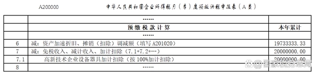 第二步,填報(bào)加計(jì)扣除情況。在《中華人民共和國(guó)企業(yè)所得稅月(季)度預(yù)繳納稅申報(bào)表(A類)》(A200000)第7行“減:免稅收入、減計(jì)收入、加計(jì)扣除”下的明細(xì)行次中,填寫“高新技術(shù)企業(yè)設(shè)備、器具加計(jì)扣除(按100%加計(jì)扣除)”事項(xiàng)及加計(jì)扣除金額。表單節(jié)選部分填報(bào)如下: