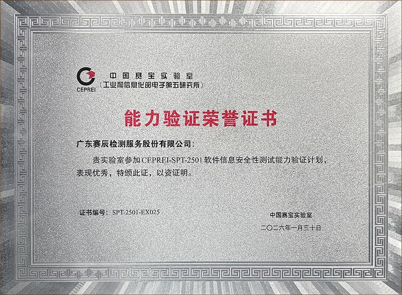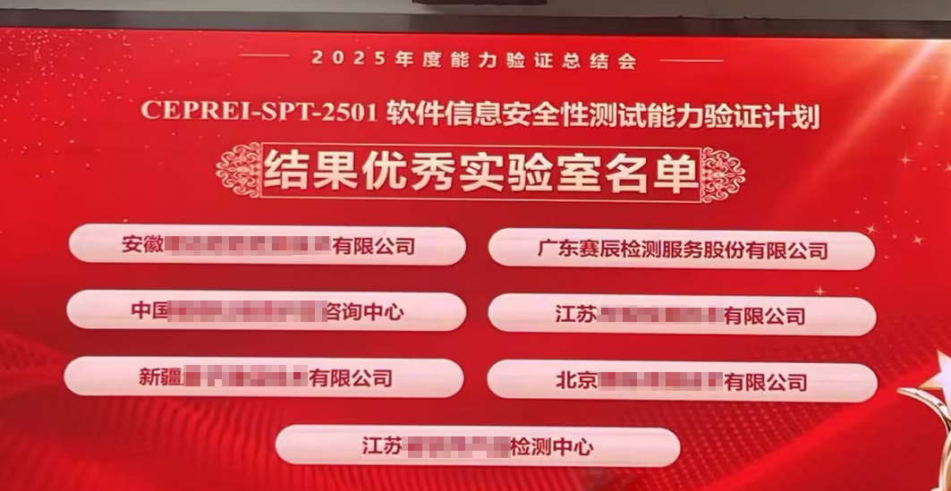 廣東賽辰檢測服務股份有限公司(簡稱"賽辰")憑借扎實的技術(shù)實力、規(guī)范的測試流程和穩(wěn)定的質(zhì)量管理水平,在CEPREI-SPT-2501軟件信息安全性測試能力驗證中嚴格按照能力驗證要求制定測試方案,編寫測試用例并反復驗證,對測試結(jié)果進行科學分析,獲得評審專家的高度認可,以優(yōu)異成績脫穎而出,榮評"2025年度軟件信息安全性測試能力優(yōu)秀實驗室"稱號。